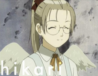 Hikari is cheerful and a bit daring. She has been a Haibane for 4 years. She works in the bakery and helps Rakka visit the temple of the Haibane Renmei. Her name means "light" because in her dream she saw a bright light. I'll add more info and thoughts later when i know more.